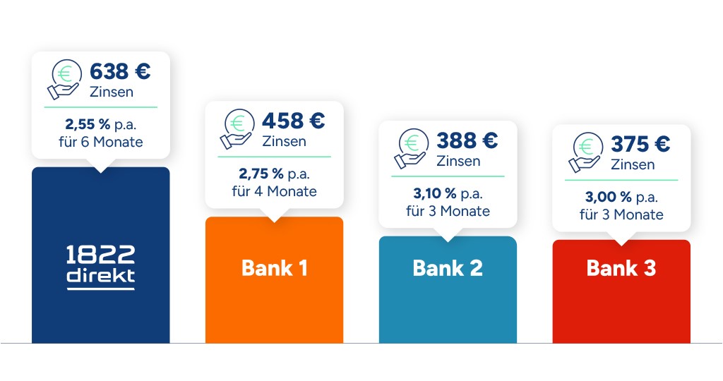 | Zinssatz | 2,55 % Zinsen p.a. für 6 Monate bis 250.000 € Die Sonderverzinsung gilt für Personen, die innerhalb der letzten 12 Monaten kein Tagesgeldkonto bei der 1822direkt geführt haben. Das Angebot gilt nicht für Kunden der Frankfurter Sparkasse. |